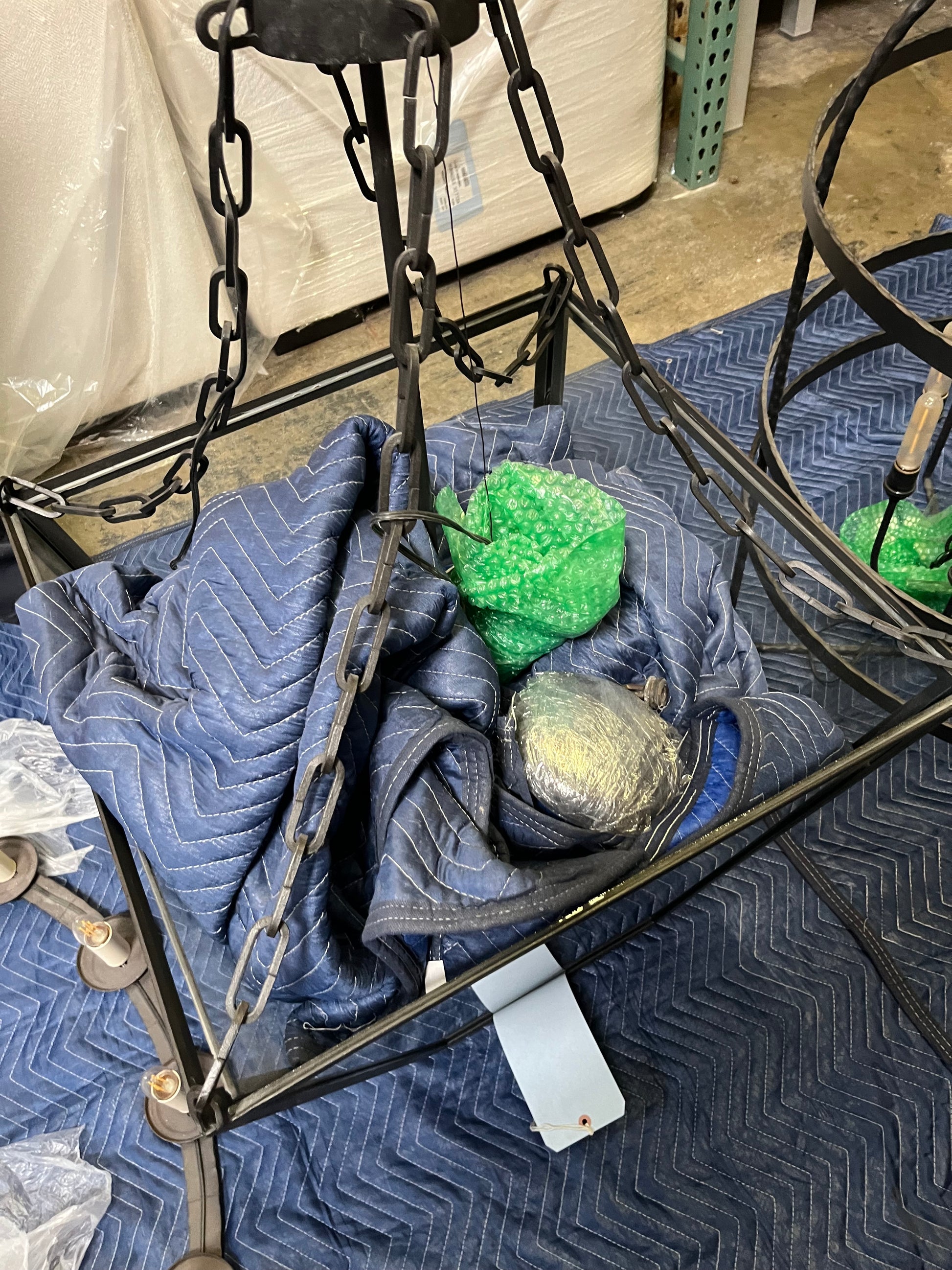 The stately Andie Lantern has shimmering glass panels that create an impressive introduction to a large foyer or grace an extended hallway. Braced in its forged iron frame and chained to its fulcrum above, the 4 light Andie, seen here in Ironware’s Black finish, sports modern burnished sockets and ships with bulbs as shown.