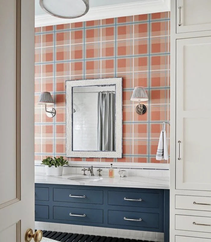 Tartan refers to the pattern of interlocking stripes, running in both the warp and weft and has been made in Ireland and Scotland for hundreds of years. We played with fun color combinations for our designs and printed on them on metallic grasscloth for added texture.