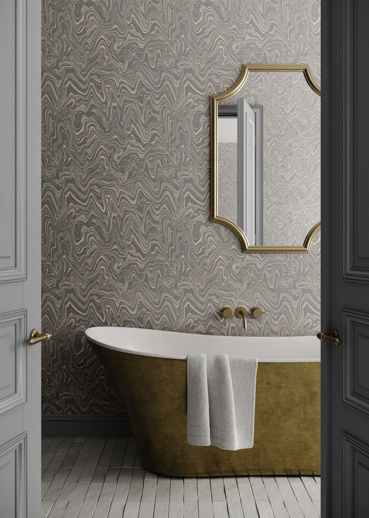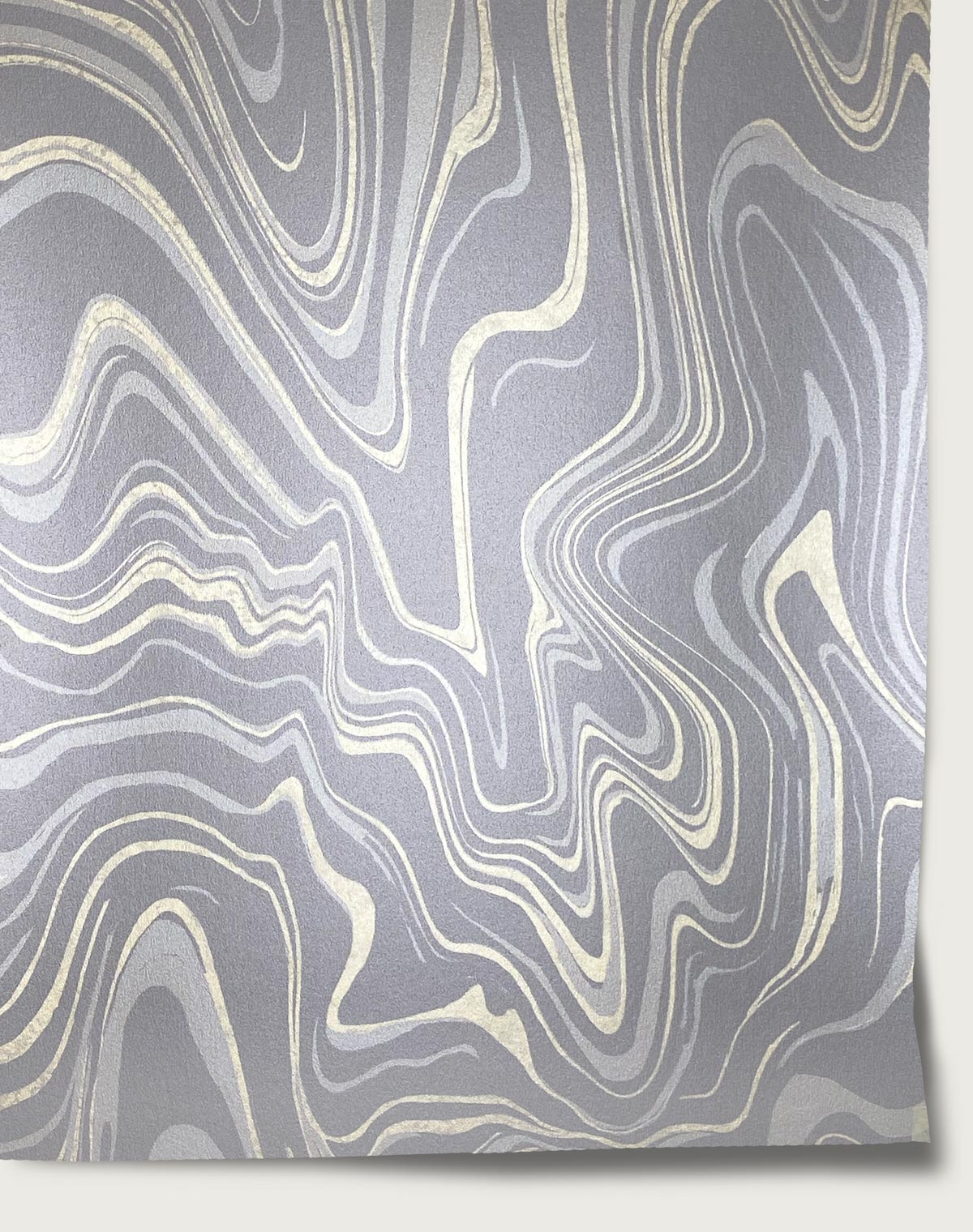 Time Shift features an undulating marble effect with a mesmerizing quality. Printed on mica-coated paper, the design has a subtle sheen which is further enhanced by a hint of metallic gold or silver. The tone on tone colors shift this classic design to modern refined glamour.
