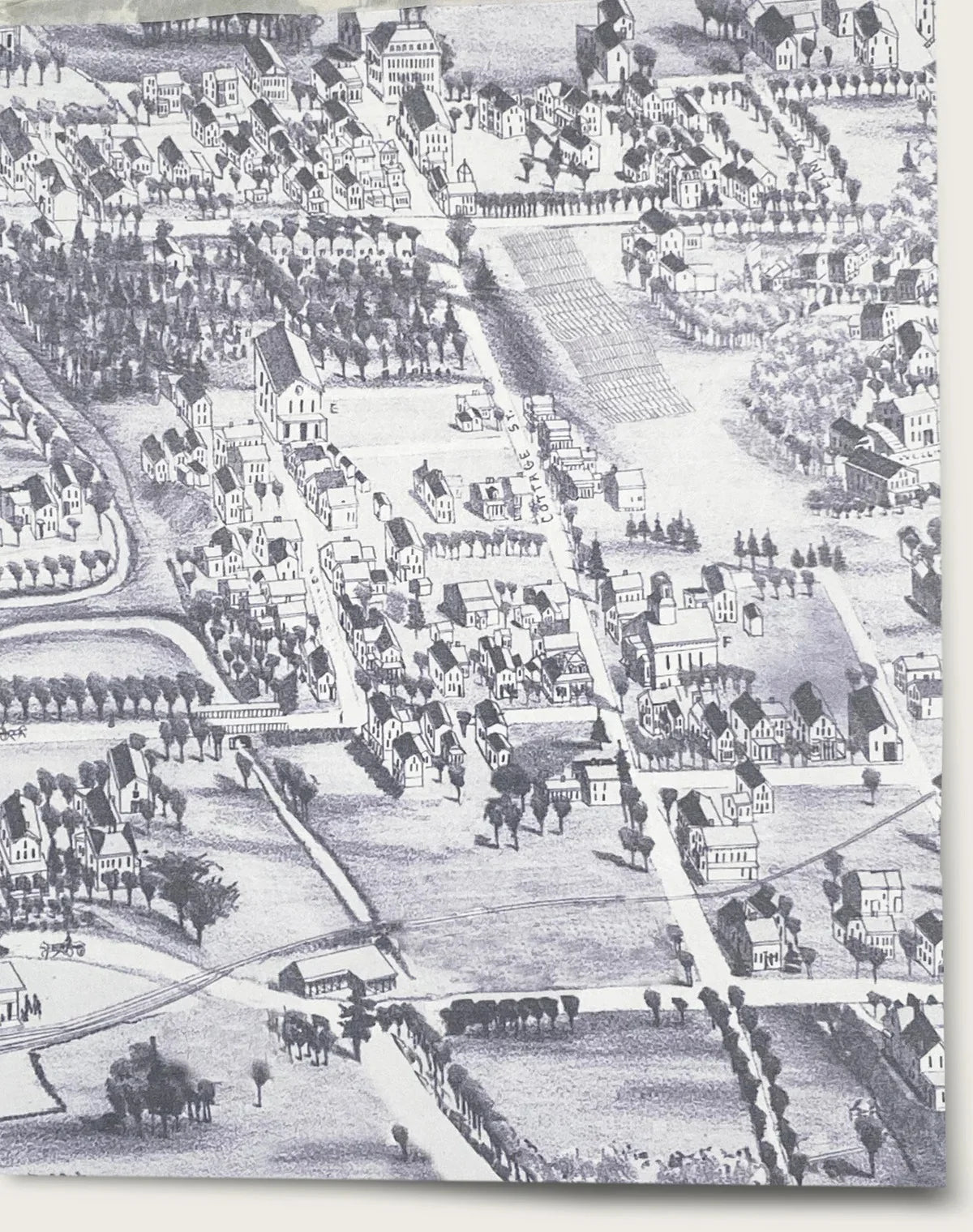 Late 19th-century bird’s-eye maps captured entire towns from above, complete with trains, churches, and bustling main streets. Our Village Green pattern reimagines that tradition with a playful, illustrative lens, an ode to the community heart of small towns. This design makes a striking mural for spaces that invite storytelling and delight.