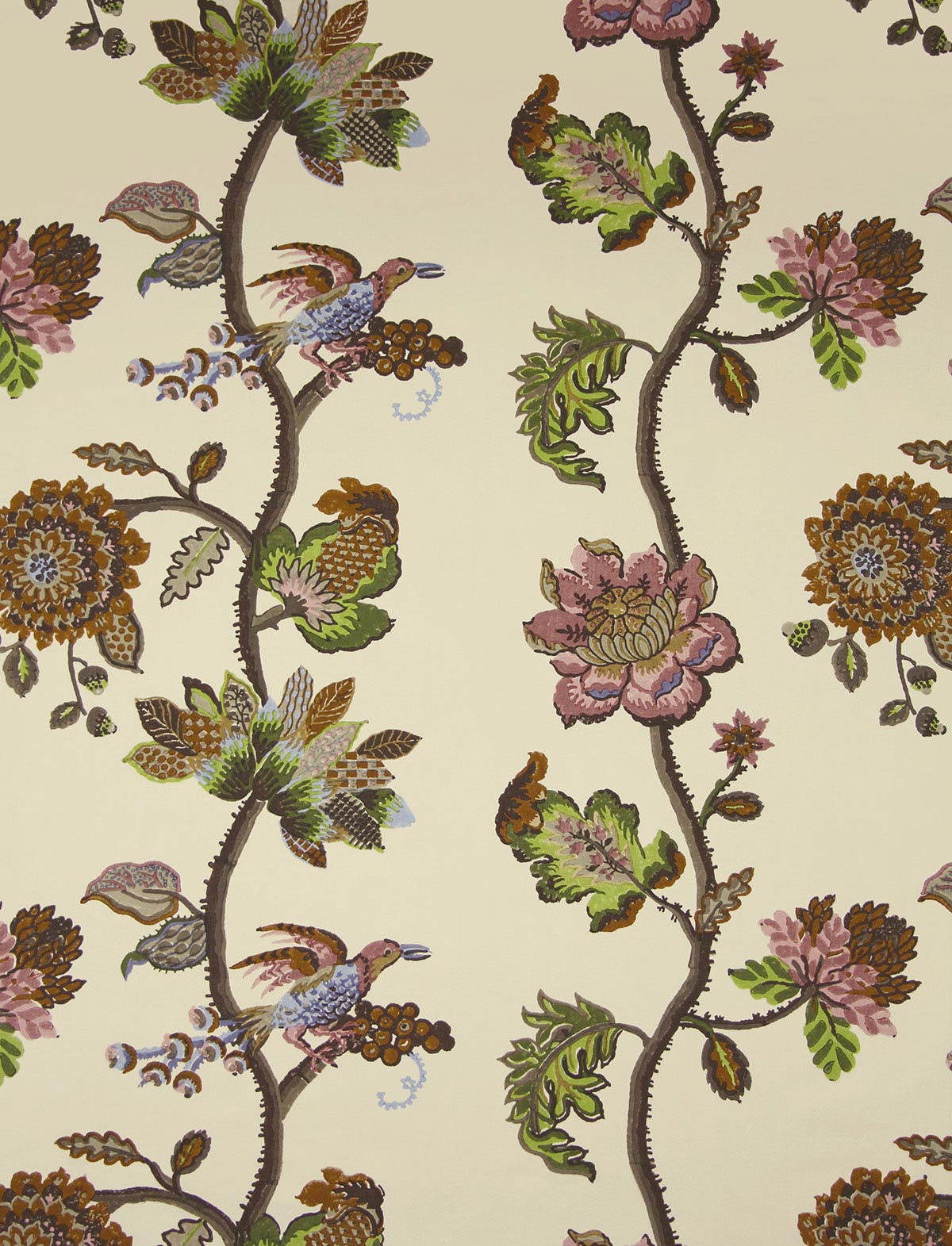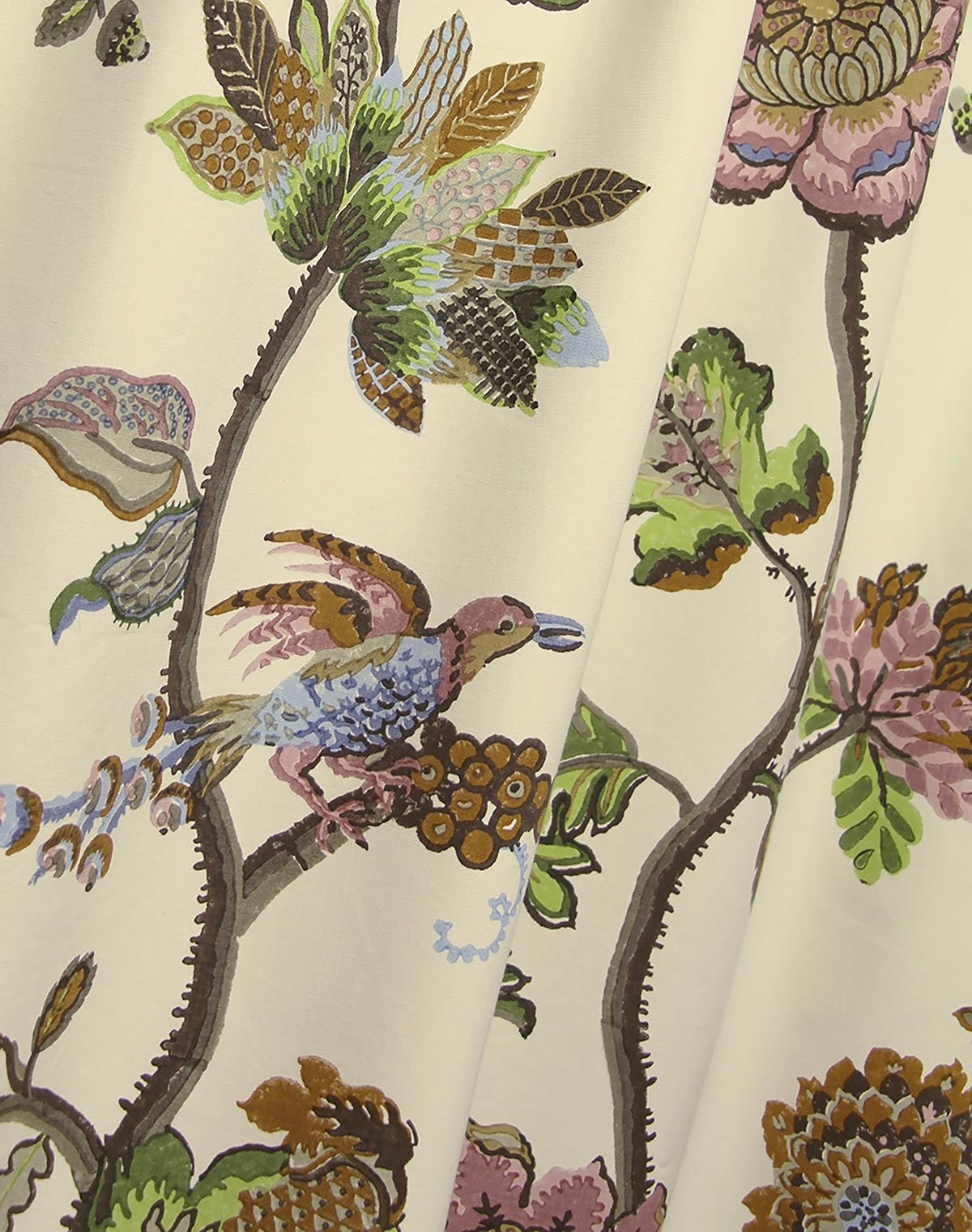 In a captivating style reminiscent of the Tree of Life, this beautiful hand block print comes alive with its artful portrayal of stylized flowers and graceful birds. A destined favorite in the Classic Cloth collection, this fabric is crafted by hand using 70 blocks on a cotton ground creating a patchwork of colors. An extremely versatile fabric with an ideal weight for walls, upholstery, and drapery.