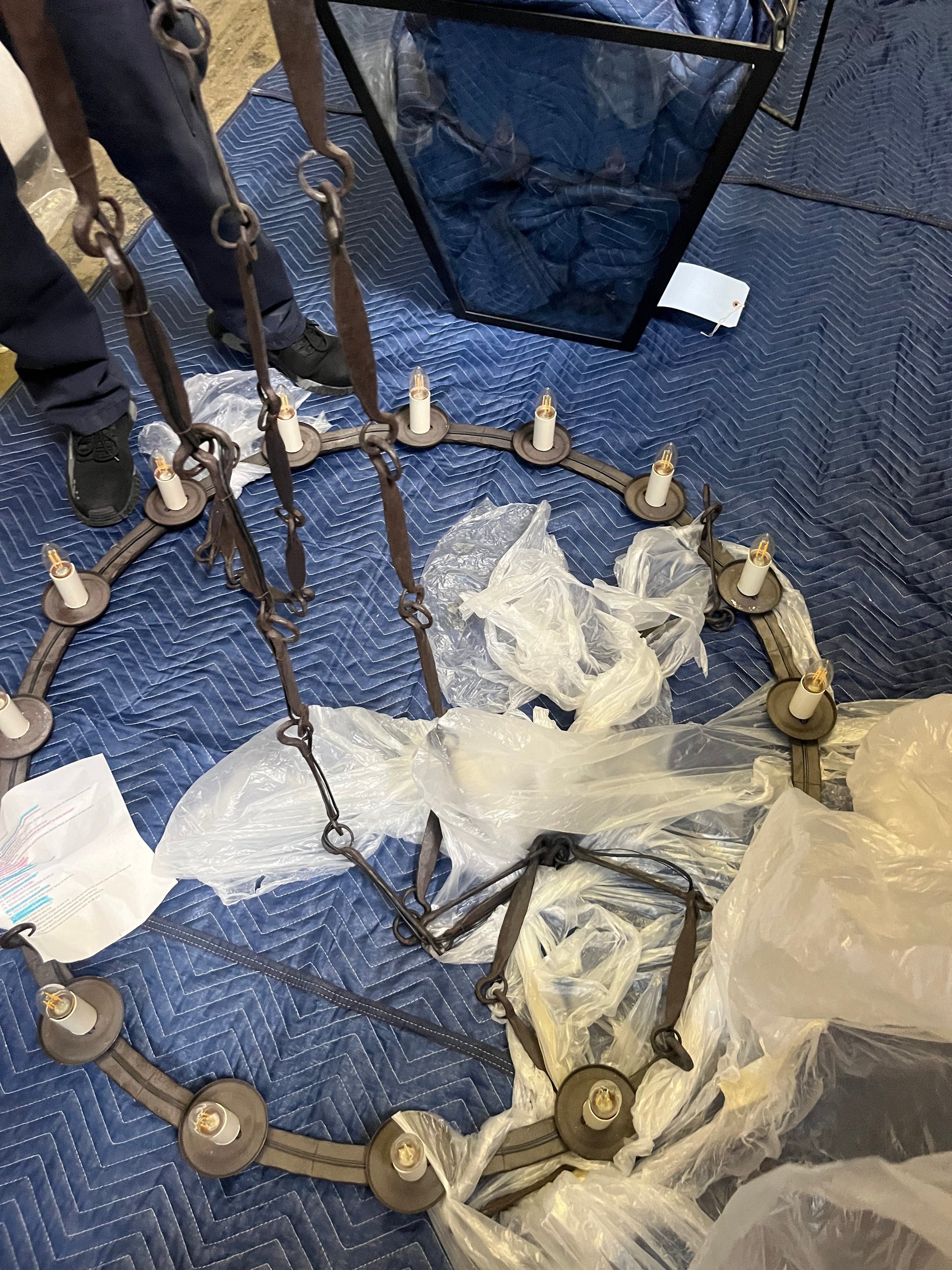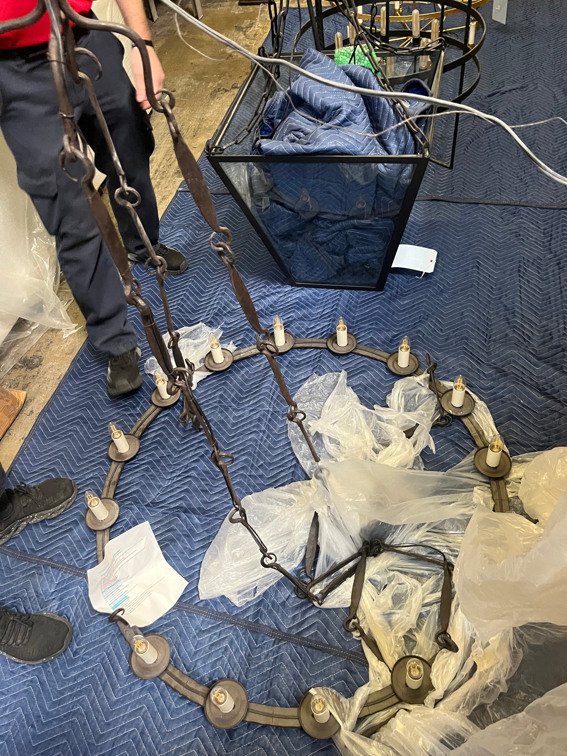 The Marcella 16 Light Chandelier illustrates the talent our stateside blacksmiths bring to their craft, as you can see how the tradition of forging iron shines in our products. The handsome hand-forged hook and forged links that connect the chandelier to its ceiling canopy suspend a flat band that has been beautifully hammered for a hint of texture. Shown here in a Pewter finish, the Marcella comes in most of our fine finishes that are meticulously applied by hand by our skilled artisans in our Nashville studio. This is one of our designs that is so popular we have produced it in a number of custom sizes and shapes.