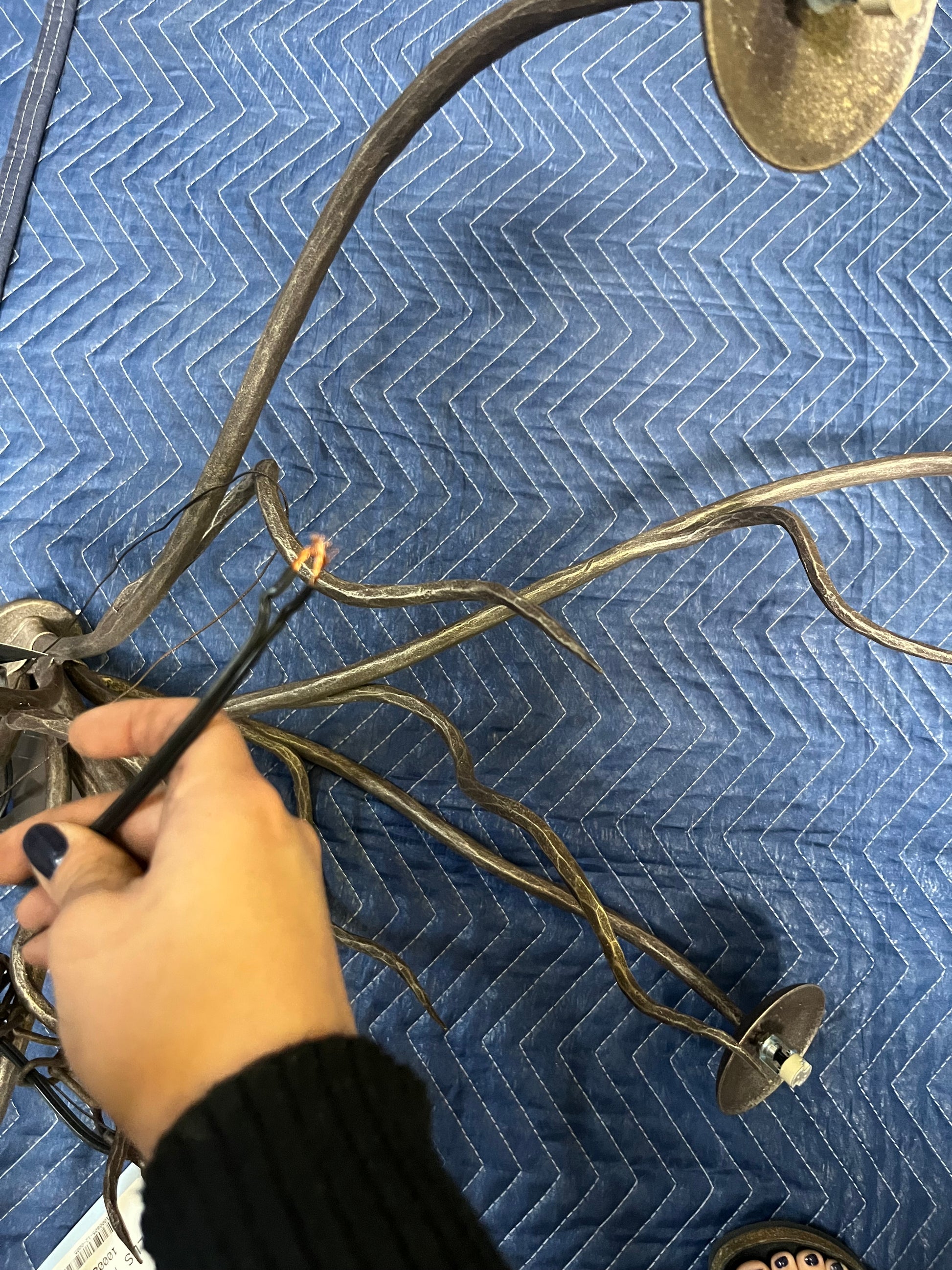 As buoyantly poetic as sea grasses billowing in deep currents, the Ondine Chandelier will bring a bit of oceanic winsomeness to any interior. This asymmetrical, 7-light beauty is one of the signature styles of our artisan Blacksmiths. Made of forged wrought iron, Ondine is available in all of our fine finishes. This is one of our highly versatile designs that we have produced in a number of custom sizes and shapes.