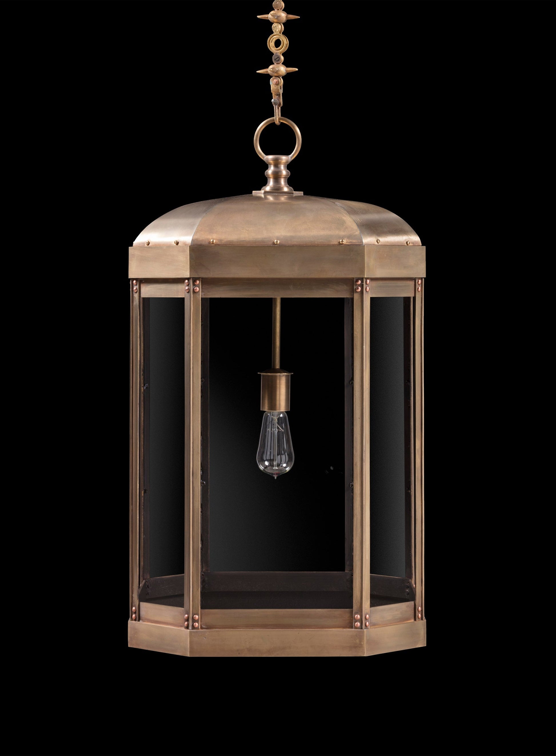 The Large Hanging Bradshaw is a patinated, octagonal hanging lantern in the Art Deco style. With canted corners, riveted domed top and moulded sides.