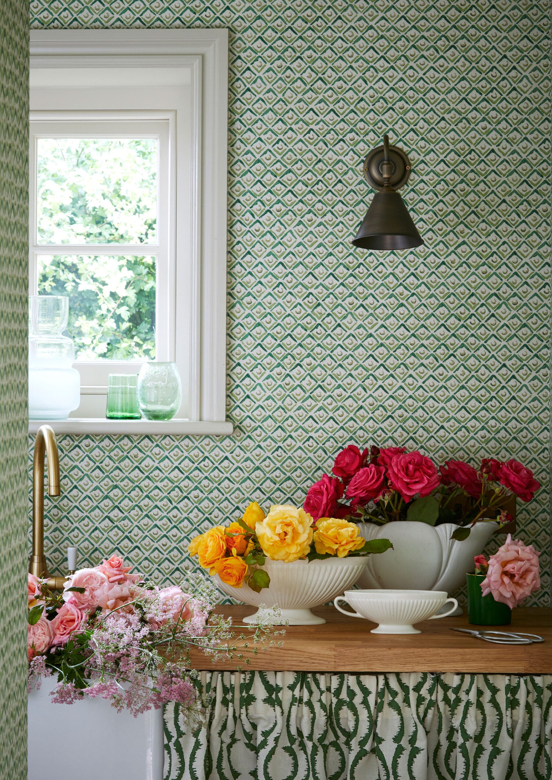 The softly painted detail within the motifs of Marmorino is recreated here as an allover small scale geometric.