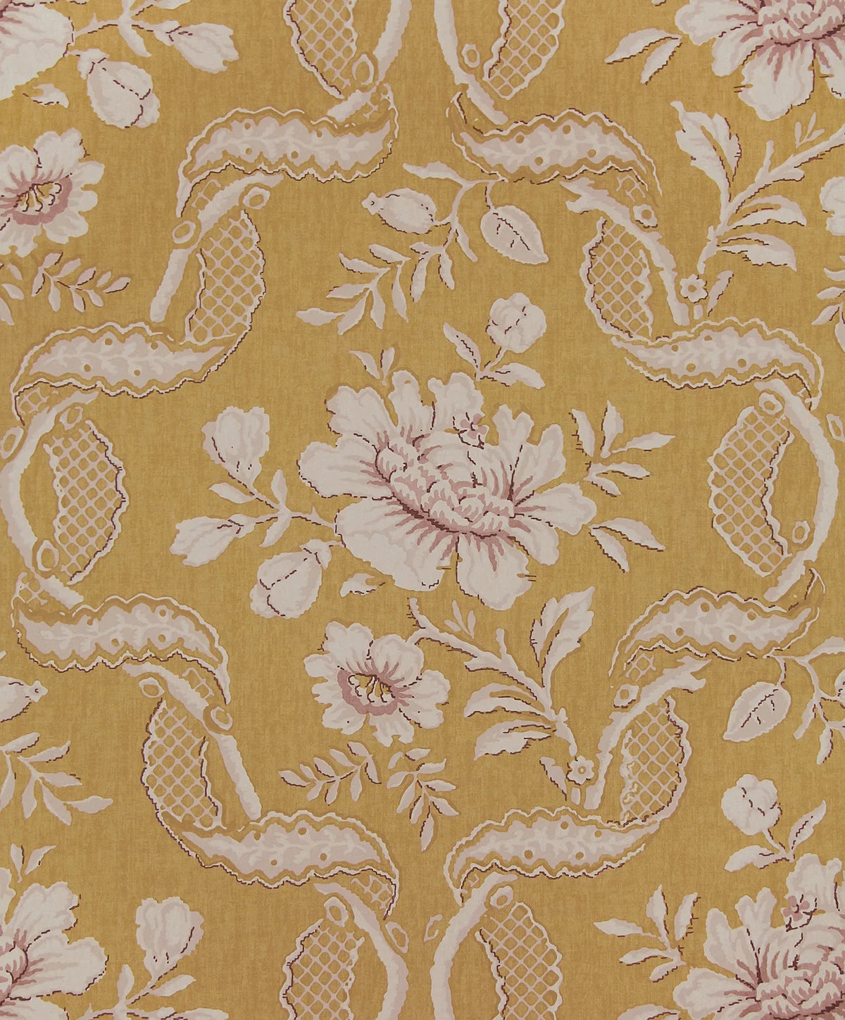 Camille is a traditional wallpaper design featuring graceful ribbons and vines that frame delicate floral motifs. This period print is available in six vibrant colorways and a timeless complement to the coordinating fabric.